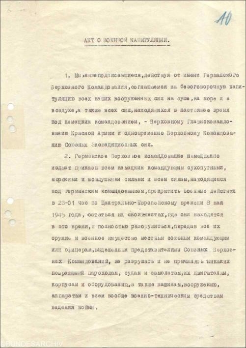 „Die deutschen Streitkräfte zu Lande, zu Wasser und in der Luft sind vollständig geschlagen und haben bedingungslos kapituliert und Deutschland, das für den Krieg verantwortlich ist, ist nicht mehr fähig, sich dem Willen der siegreichen Mächte zu widersetzen.